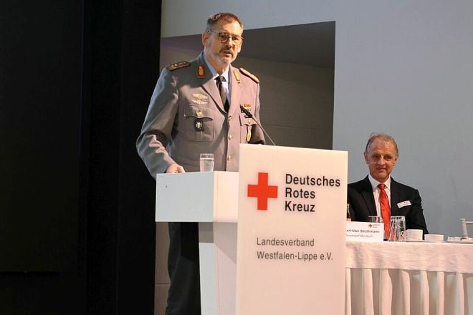 Die Festrede der DRK-Landesversammlung hielt der Kommandeur des Kommando Gesundheitsversorgung der Bundeswehr, Generalstabsarzt Dr. med. Johannes Backus zum Thema „Die zivilmilitärische Zusammenarbeit zwischen der Bundeswehr und dem DRK“.